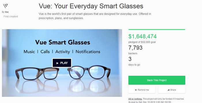 Son kullanıcı için akıllı gözlüklerin hem ulaşılamaz hem de pahalı olmasından ortaya çıkan akıllı gözlük Vue geçtiğimiz ay günlük kullanım için akıllı gözlük sloganı ile Kickstarter’da 50 bin dolar hedef ile fon toplamaya başlamıştı. Vue akıllı gözlük büyük ilgi gördü ve toplanan fon 1.6 milyon doları geçti.