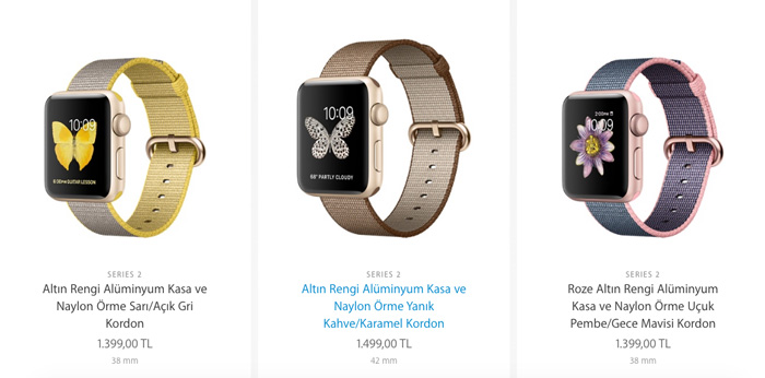 Apple Watch Series 2 modellerinde 38 mm 1399 liradan başlarken 42 mm 1499 liradan başlayan fiyatlara sahip. İlk Apple Watch’un biraz daha güçlü hali olan Apple Watch Series 1 ise 38 mm 1049, 42 mm 1149 lira olarak satışa sunulmuş durumda. İlk Apple Watch ise artık satışta değil.