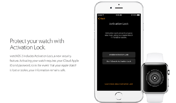 Apple, akıllı saati Apple Watch’un başkalarının eline geçtiği zaman kullanımını yasaklayan aktivasyon kilidi özelliğini watchOS 2 ile getirdiği ortaya çıktı.
