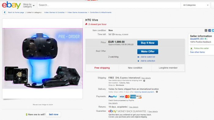 Dünyanın en büyük alışveriş sitelerinden ebay’de dasatd18 isimli kullanıcı, HTC Vive için 1100 euroluk ön sipariş satışı açarak bir anda heyecan yarattı. Ürünün henüz ön siparişi bile başlatılmadan bu şekilde bir satışın gerçekleşeceğinin ortaya çıkması ilanın fake olabileceği sorularını akıllara getirdi. Ancak ilanı veren dasatd18 isimli kullanıcının 469 geri bildirimi ve yüzde yüz güvenilir kullanıcı profiline sahip olması farklı soru işaretlerini de beraberinde getirdi.