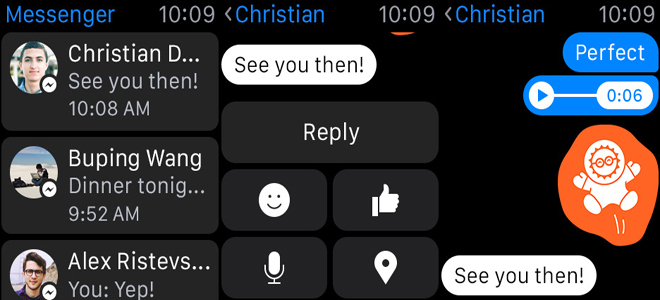 Apple Watch için gelen Facebook Messenger uygulamasında mesajlaşma işleminin dışında konum paylaşma özelliği de bulunurken uygulamanın tasarımı diğer mesajlaşma uygulamalarına benzer bir tasarıma sahip.