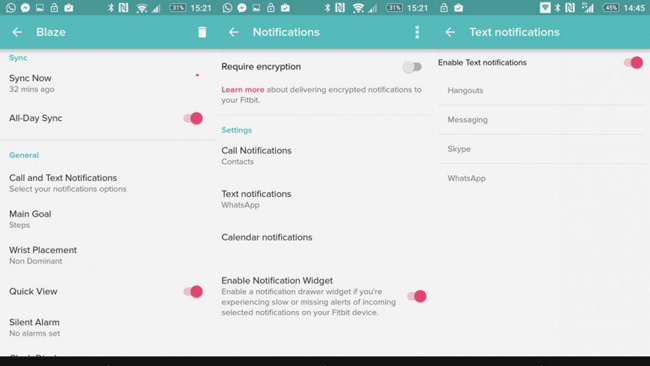 Fitbit Android uygulaması üzerinde yapılan metin bildirimleri ayarları sayesinde kullanıcılar Fitbit Blaze üzerinde WhatsApp mesajlarını görebiliyor. Kullanıcılar bu özellik sayesinde akıllı saatleri üzerinden sadece WhatsApp değil Skype ve Google Hangouts gibi mesajlaşma servislerini de aktif ederek kullanabiliyor.