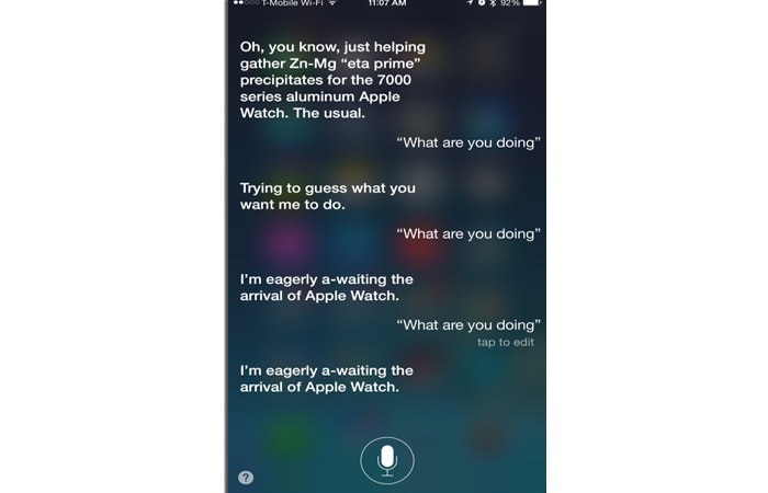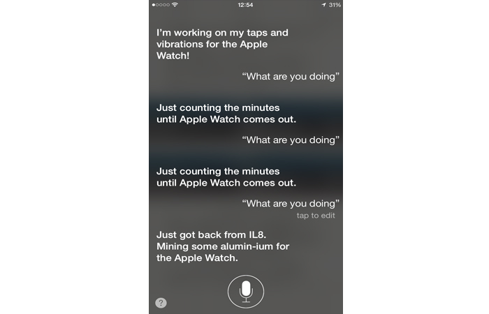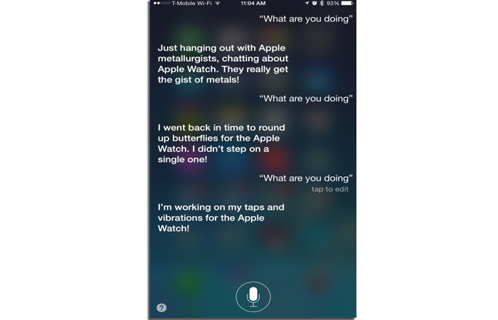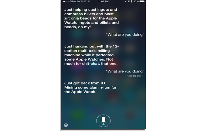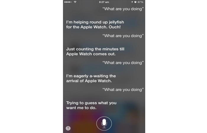 Apple Watch‘ın ne zaman çıkacağı sorulduğunda farklı farklı cevaplar ile akıllı saatin çıkış tarihini belirten Siri, “Ne yapıyorsun?” sorusuna da ilginç ve eğlenceli şekillerde Apple Watch ile birlikte cevap verdi. Sizler için hazırladığımız galerimizden Siri‘nin vermiş olduğu eğlenceli cevaplara göz atabilirsiniz.