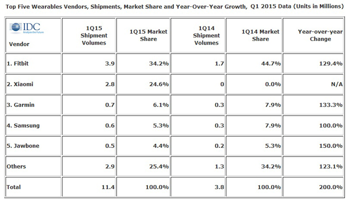 IDC’nin yayınladığı tabloda ilk 5’te Fitbit, Xiaomi, Garmin, Samsung ve Jawbone yer alırken ilk çeyrek toplamında 11.4 milyonluk giyilebilir teknoloji ürünü satışı yapılmış. Asus, Sony, LG ve Pebble gibi markaların bu pazardan aldıkları toplam oran ise yüzde 25.4 yani bu kalan diğer markaların toplam satışı Xiaomi’nin tek başına yaptığı satış sayısına eşit.