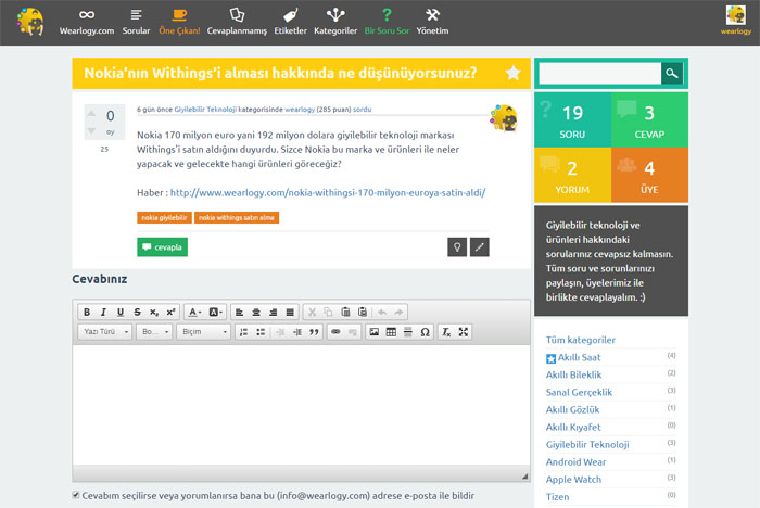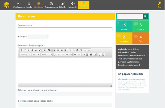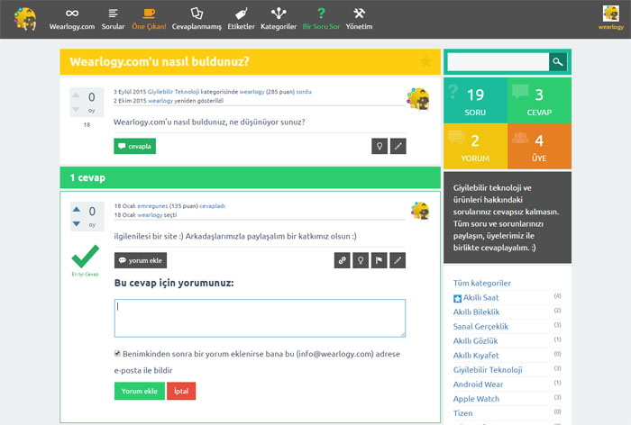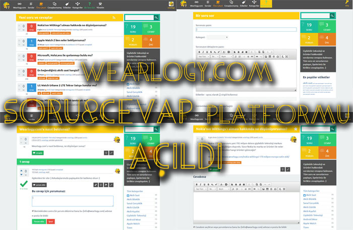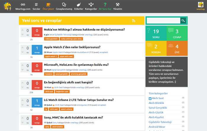 Wearlogy.com anasayfası üzerinden sağ üst kısımda bulunan Soru&Cevap sekmesinden platforma ulaşabilir ve yine Wearlogy.com‘un sağ sütunundan son soruları ve cevaplanan son soruları görebilirsiniz.