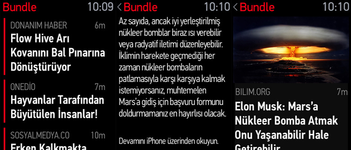Dwarf Planet tarafından geliştirilen Bundle uygulaması sadece mobil cihazlar üzerinden kullanılabilen bir hizmetken gelen Apple Watch desteği sayesinde bundan böyle akıllı saat üzerinden de haber okutmaya ve içerik göstermeye başlayan bir haber servisi oldu.