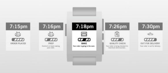 Domino’s Tracker uygulaması üzerinden Pebble akıllı saatleri ile henüz pizza sipariş vermek mümkün olmasa da uygulama ile siparişlerin sisteme düşmesinden hazırlanmasına, paketlenmesinden yola çıkmasına kadar tüm işlemler takip edilebilecek.