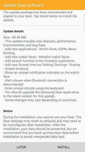 Gear S2 için güncellemenin getirdiği 3 yeni uygulama World Clock dünya saati uygulaması, ESPN spor uygulaması ve News Briefing haber uygulaması olarak karşımıza çıkacak. Bunlarla birlikte yeni güncelleme akıllı saatin bildirim özelliğini de geliştirerek gelen bildirimleri uygulamalar üzerinde iOS sisteminde olduğu gibi yuvarlak kırmızı bir belirteç ile gösterecek.