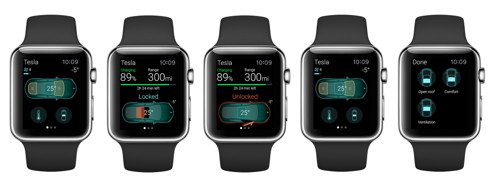 Eleks Labs firması yaptığı bir açıklama ile Tesla marka otomobiller için bir Apple Watch uygulaması geliştirdiğini duyurdu. Firmanın geliştirmiş olduğu bu Apple Watch uygulaması Tesla otomobilleri üzerinde uzaktan kapıların kilitlenip açılması, farların kapatılıp açılması, korna çalma, klimayı kontrol etme ve sunroof kontrolü gibi özellikler içeriyor. Geliştirilen uygulama bu özelliklerin yanında Tesla otomobillerin batarya güçlerini ve sürelerini, gidebilecekleri mesafeleri, hızını ve harita üzerindeki konumu gösterebiliyor.