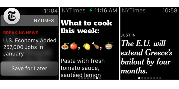 TNYT(The New York Times) geliştirdiği uygulama sayesinde akıllı saatlerin küçük ekranlarında okuma problemini kendince gidermiş. Haberleri tek cümlelik formatlara dönüştüren uygulama kullanıcıya her geçişte haberin farklı bir kısmını sunacak. Aslında haberleri kısa başlıklar haline dönüştürme olarak tanımlayabileceğimiz bu durum ufak görsellerle de desteklenecek.